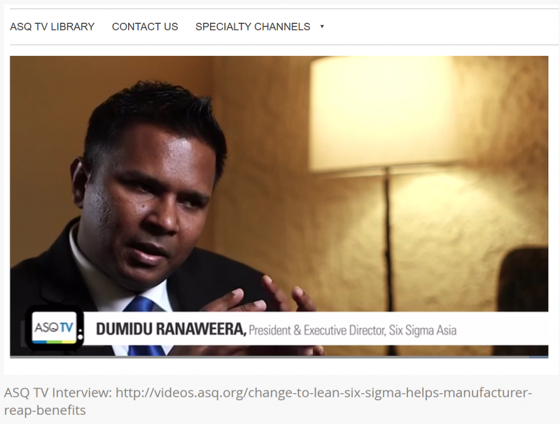 On March 2016, Dumidu Ranaweera - President/ Executive Director spoke to ASQ TV on Lean Six Sigma Deployment strategies (i.e. Applied Lean Six Sigma, iMapping, RAT) during an interview held during 2016 ASQ Lean and Six Sigma Conference. He was an invited Guest Speaker at the conference for the third consecutive time which held at Pointe Hilton Tapatio Cliffs Resort in Arizona, USA.